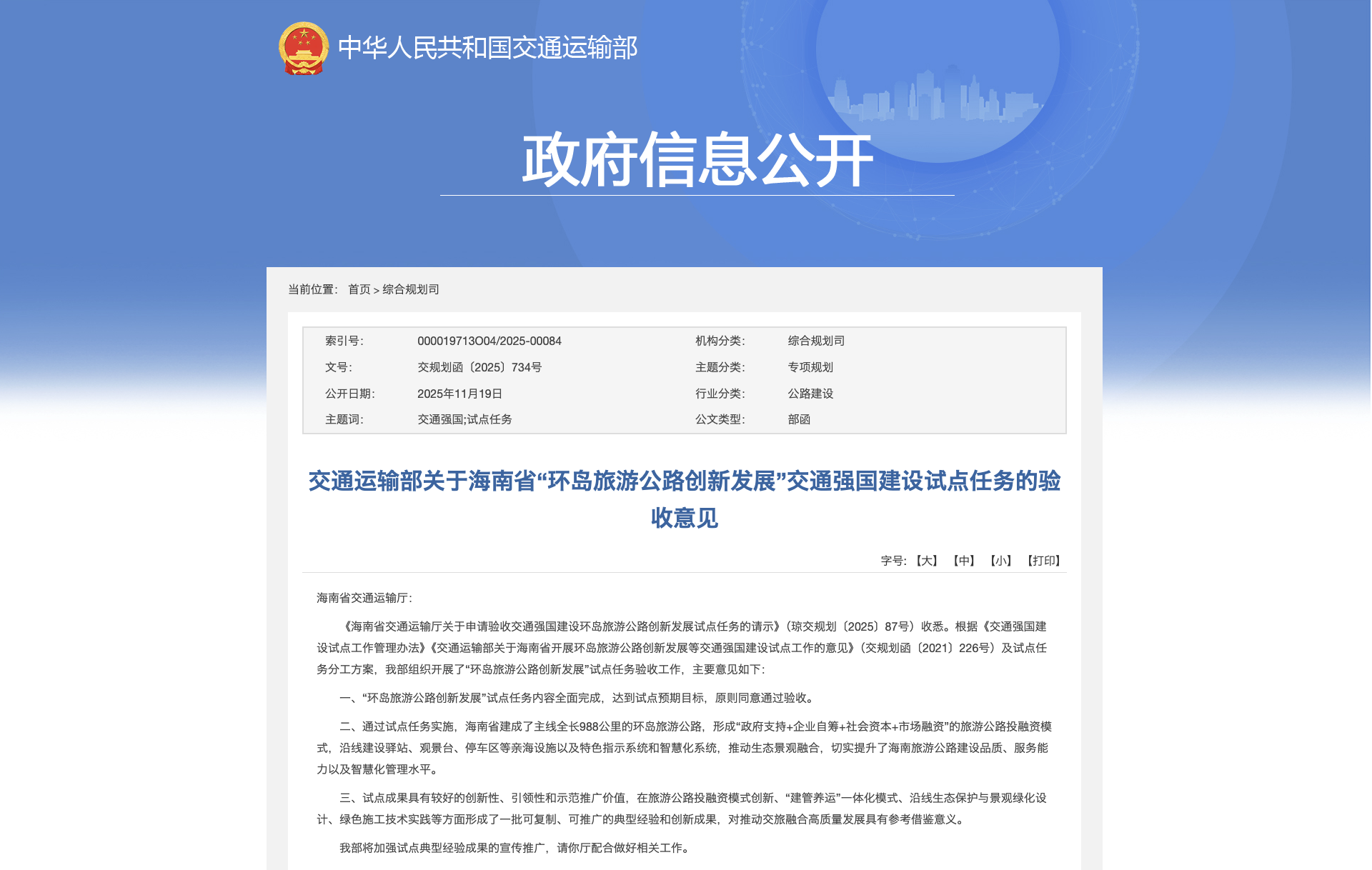 近日,海南环岛旅游公路交通强国建设试点任务顺利通过交通运输部验收,面向全国推广在旅游公路建管养、交旅融合等方面形成的典型经验。作为试点任务重要组成部分,YP街机电子科技承建的环岛旅游公路云控中心有效提升海南环岛旅游公路智慧化管理水平与服务能力,助力打造国家级智慧旅游公路。
